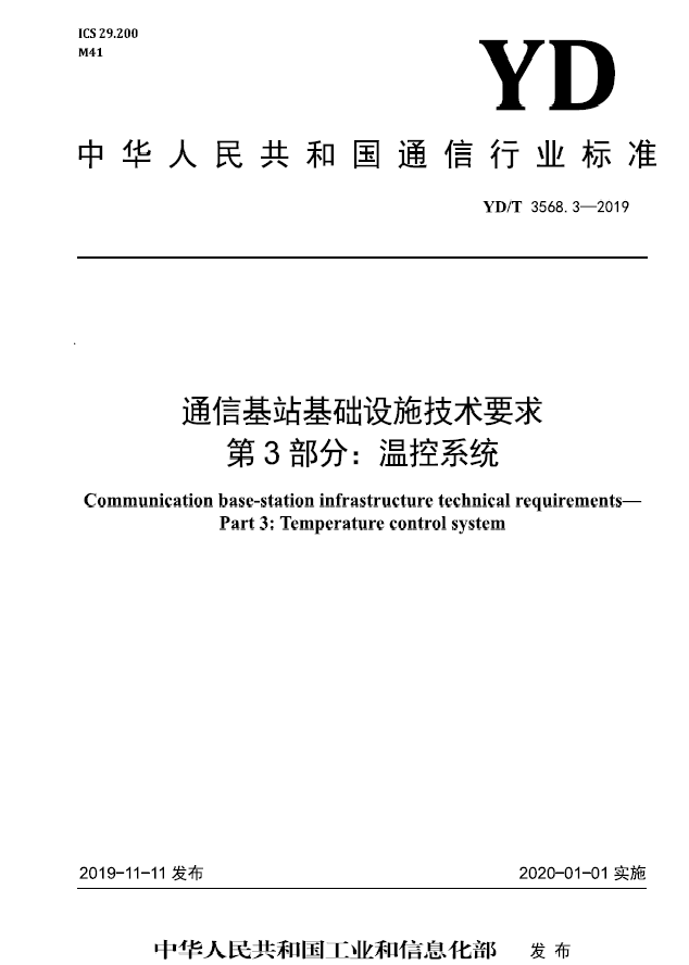 我司參與起草的《通信基站基礎(chǔ)設(shè)施技術(shù)要求 第3部分:溫控系統(tǒng)》(YD/T 3568.3-2019)行業(yè)標(biāo)準(zhǔn)經(jīng)中華人民共和國(guó)工業(yè)和信息化部批準(zhǔn)發(fā)布,已于2020年01月01日實(shí)施。該...