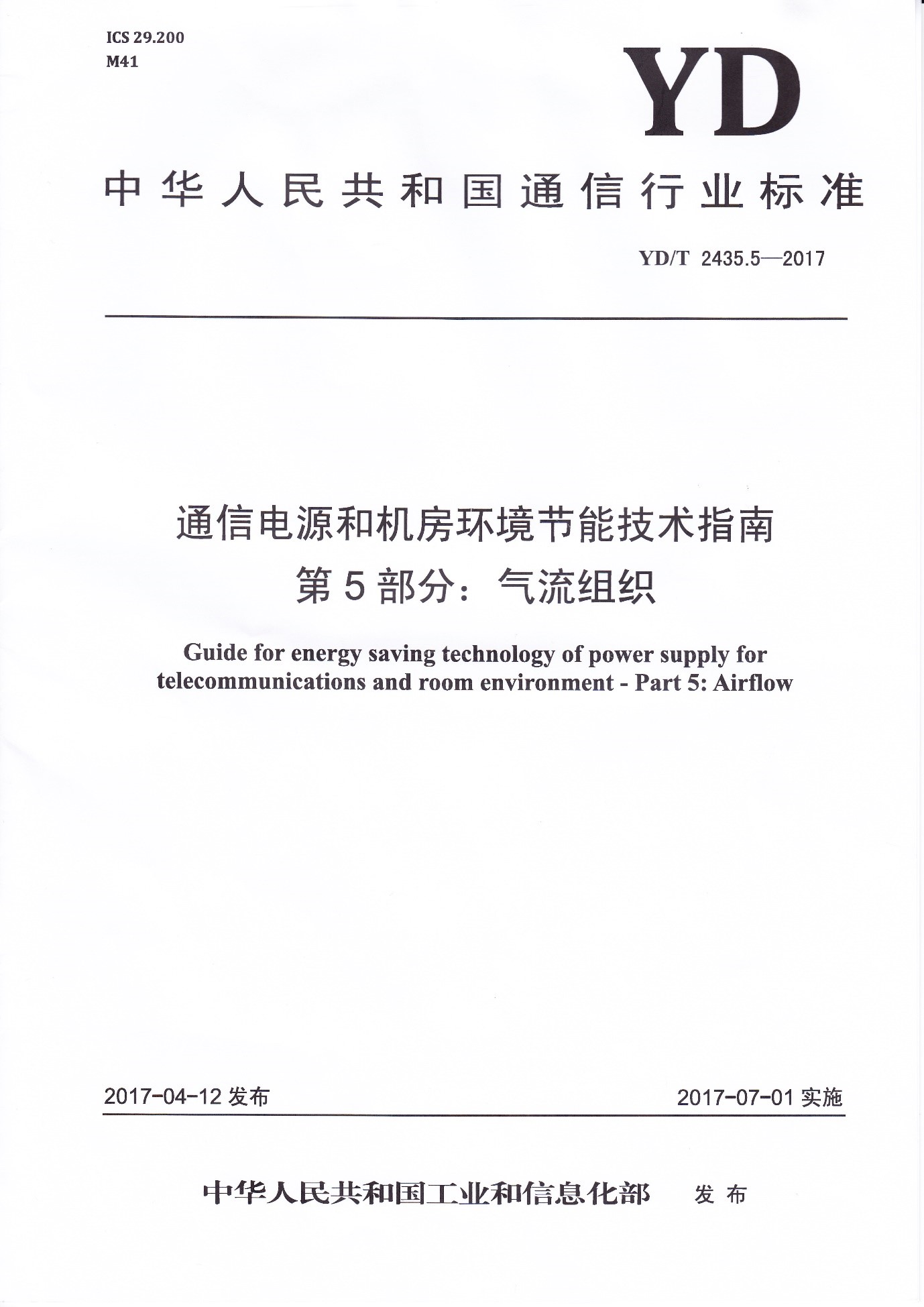 我公司參與起草的《通信電源和機房環(huán)境節(jié)能技術(shù)指南 第5部分:氣流組織》行業(yè)標準(YD/T 2435.5-2017)經(jīng)中華人民共和國工業(yè)和信息化部批準發(fā)布,于2017年7月1日正式實...
