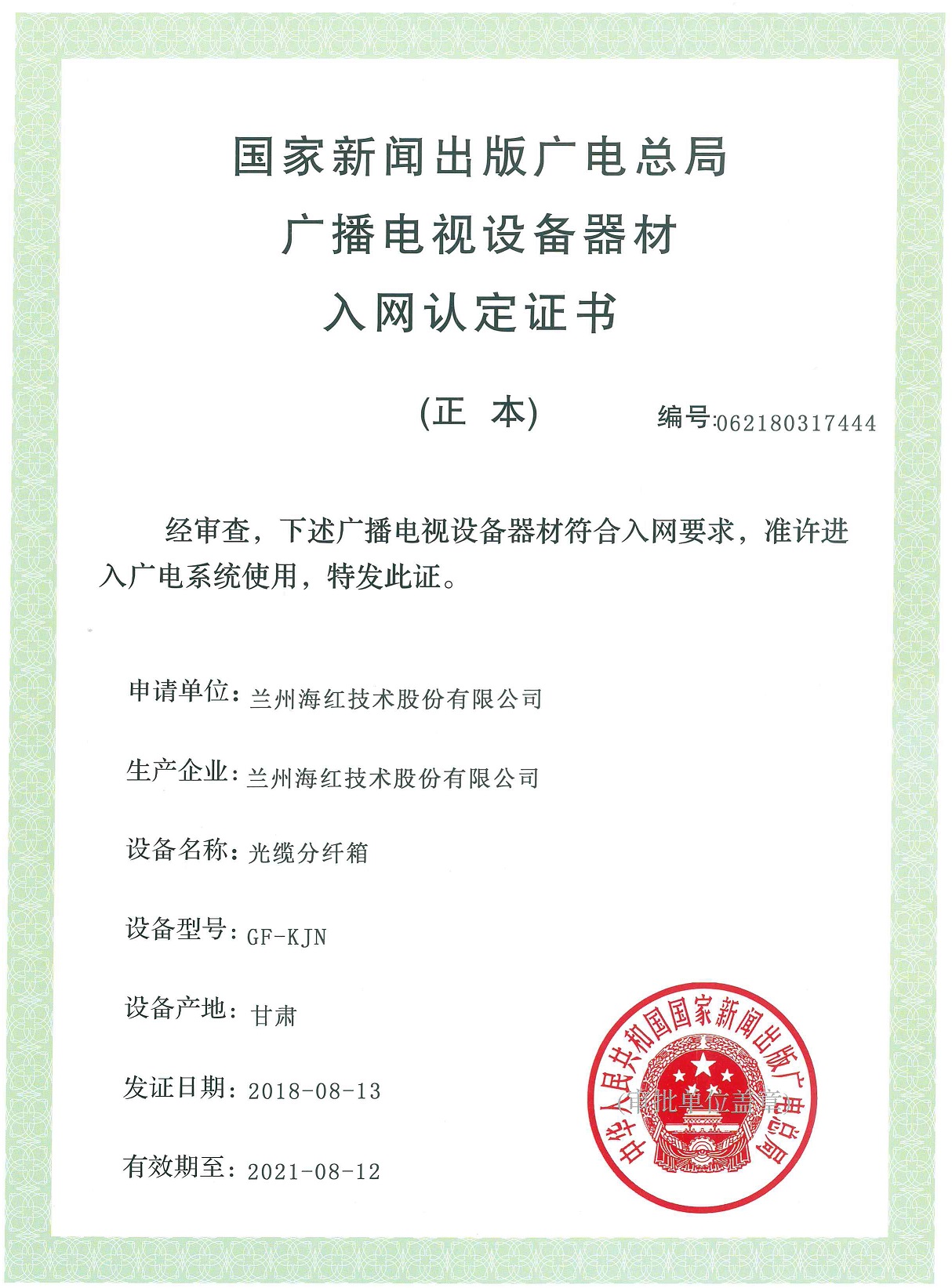 我公司的“光纜分纖箱(GF-KJN)、光纖配線架(GPX-01)、光纜交接箱(GFX-01)、綜合布線柜(HJG-Z03)”產(chǎn)品取得國家新聞出版廣電總局廣播電視設(shè)備器材入網(wǎng)認定證書...