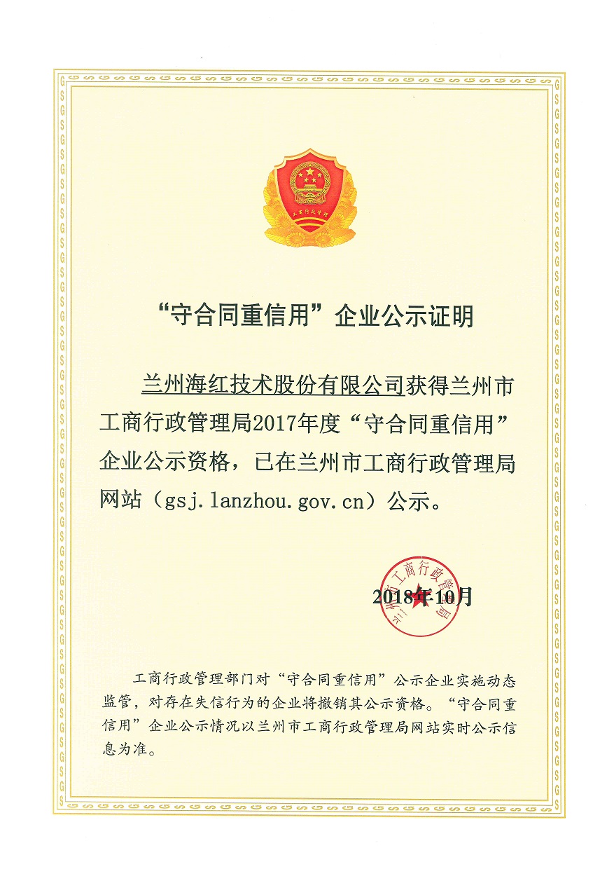 我公司被蘭州市工商行政管理局和蘭州市高新技術(shù)產(chǎn)業(yè)開發(fā)區(qū)管理委員評定為2017年度“守合同、重信用”企業(yè)。