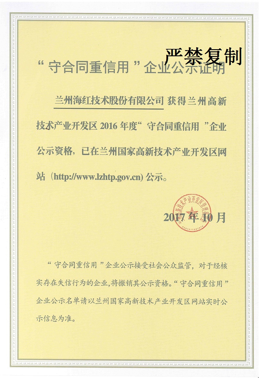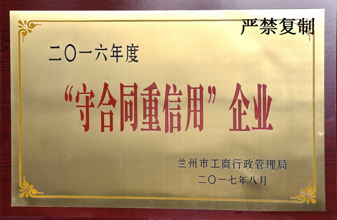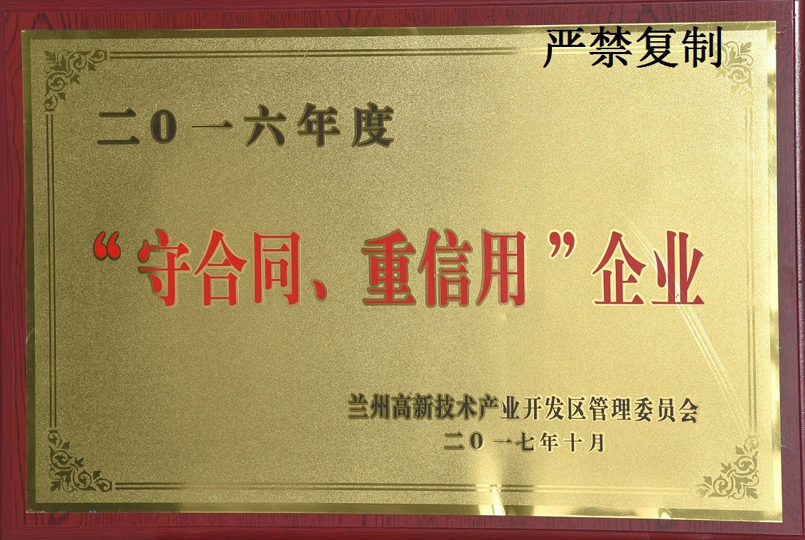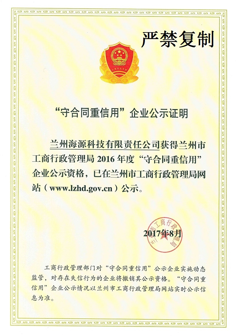 我公司及子公司(海源科技)被蘭州市高新技術(shù)產(chǎn)業(yè)開發(fā)區(qū)管理委員會(huì)評(píng)定為2016年度“守合同、重信用”企業(yè)。同時(shí)我公司被甘肅省工商行政管理局評(píng)定為2016年度“守合同、重信用”企業(yè),子公司(海源科技)被蘭州市工商行政管理局評(píng)定為2016年度“守合同、重信用”企業(yè)。