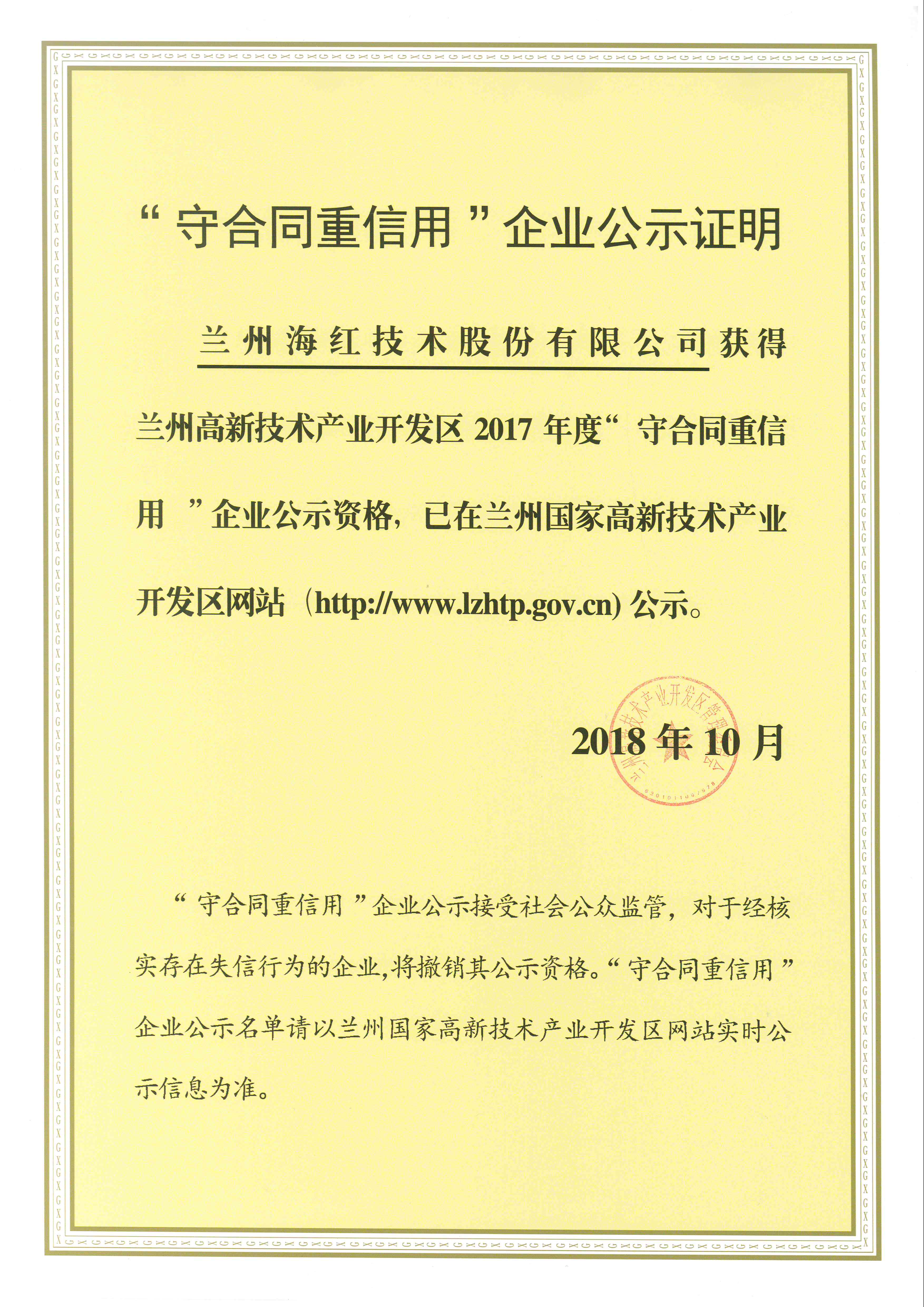 我公司榮獲2017年度蘭州市/高新區(qū)“守合同、 重信用”企業(yè)榮譽(yù)稱號 By 海紅技術(shù) 2018-11-29 00:00:00 0次 我公司被蘭州市工商行政管理局和蘭州市高新技術(shù)產(chǎn)業(yè)開發(fā)區(qū)管理委員評定為2017年度“守合同、重信用”企業(yè)。 上一篇:我司與蘭州交通大學(xué)新能源與動力工程學(xué)院共建“新能源汽車充電技術(shù)聯(lián)合研究中心”暨設(shè)立“海紅獎學(xué)金” 下一篇:我公司又取得二項實(shí)用新型專利