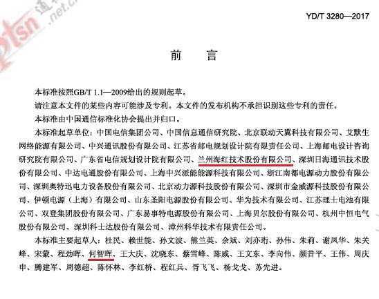 我公司參與起草的《網(wǎng)絡(luò)機柜用分布式電源系統(tǒng)》(YD/T 3280-2017)行業(yè)標準經(jīng)中華人民共和國工業(yè)和信息化部批準發(fā)布,已于2018年01月01日正式實施。我公司技術(shù)中心研發(fā)部工程師何智暉參與了該標準的起草。該標準是繼《通信電源和機房環(huán)境節(jié)能技術(shù)指南 第5部分:氣流組織》標準之后,第二個我司參與起草正式出版的行業(yè)標準。