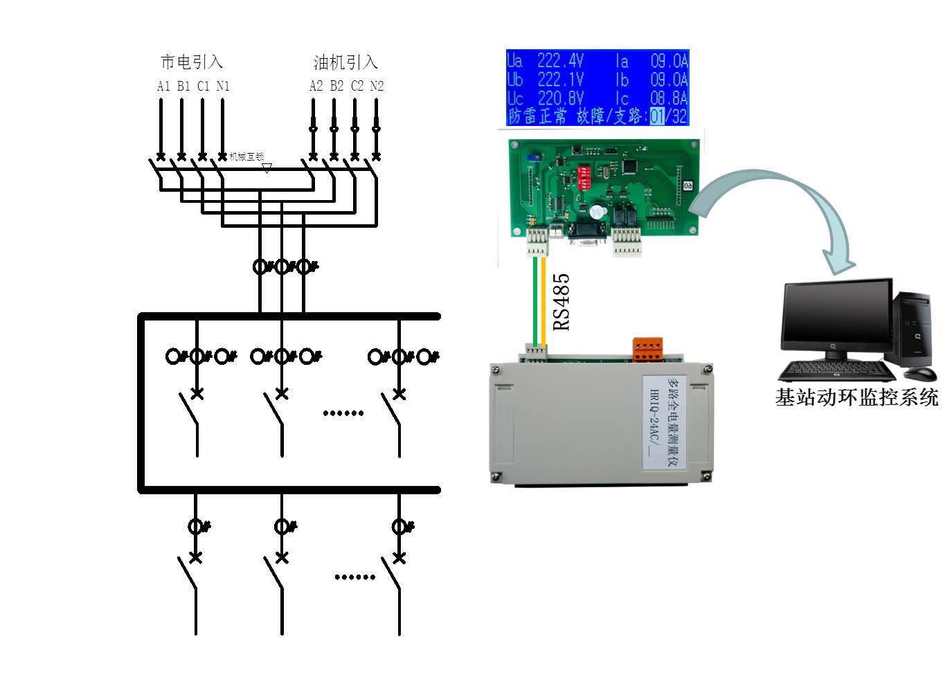 概述:此方案主要用于通信基站用交流配電防雷箱的智能監(jiān)控,對(duì)電源分配單元與防雷保護(hù)裝置進(jìn)行實(shí)時(shí)。具有市電與油機(jī)發(fā)電計(jì)量,發(fā)電時(shí)間累計(jì),各配出支路負(fù)載設(shè)備運(yùn)行監(jiān)控等功能。具備RS-485、RS-422、RS-232、以太網(wǎng)四種通信接口,可上傳數(shù)據(jù)到基站動(dòng)環(huán)監(jiān)控系統(tǒng),實(shí)現(xiàn)基站集中管理。方便用戶全面了解掌握基站交流電源及負(fù)載設(shè)備運(yùn)行情況;方便發(fā)電業(yè)務(wù)的管理考核;并為基站能耗管理、節(jié)能減排提供全面可靠的分析數(shù)據(jù)。