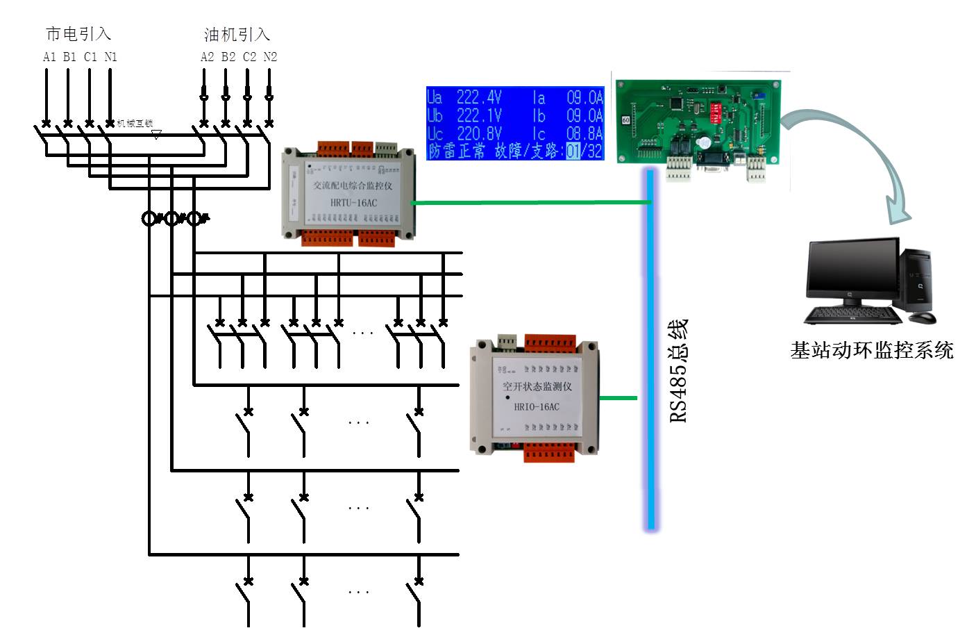 概述:此方案主要運(yùn)用于通信小型機(jī)房、基站的交流配電與防雷設(shè)備的集中監(jiān)控??蓪?duì)交流配電母線電量、防雷保護(hù)裝置等進(jìn)行實(shí)時(shí)監(jiān)控,具有配出支路開關(guān)狀態(tài)的監(jiān)測(cè),故障聲光告警,市電電能計(jì)量,油機(jī)發(fā)電時(shí)間統(tǒng)計(jì)等功能。并具備遙測(cè)、遙信、遙控功能。