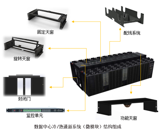 數據中心冷/熱通道系統(微模塊)是由固定天窗、旋轉天窗、功能天窗、封閉門和監(jiān)控單元和配線系統組成。