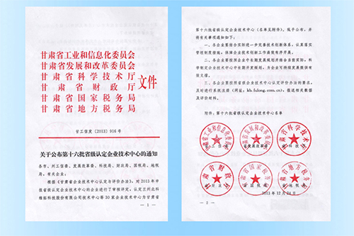 根據(jù)《甘肅省企業(yè)技術(shù)中心認(rèn)定與評(píng)價(jià)辦法》,甘肅省工業(yè)和信息化委員會(huì)會(huì)同甘肅省發(fā)展和改革委員會(huì)、甘肅省科學(xué)技術(shù)廳、甘肅省財(cái)政廳、甘肅省國(guó)家稅務(wù)局和甘肅省地方稅務(wù)局等6部門(mén)聯(lián)合審定,我公司技術(shù)中心被認(rèn)定為省級(jí)企業(yè)技術(shù)中心。